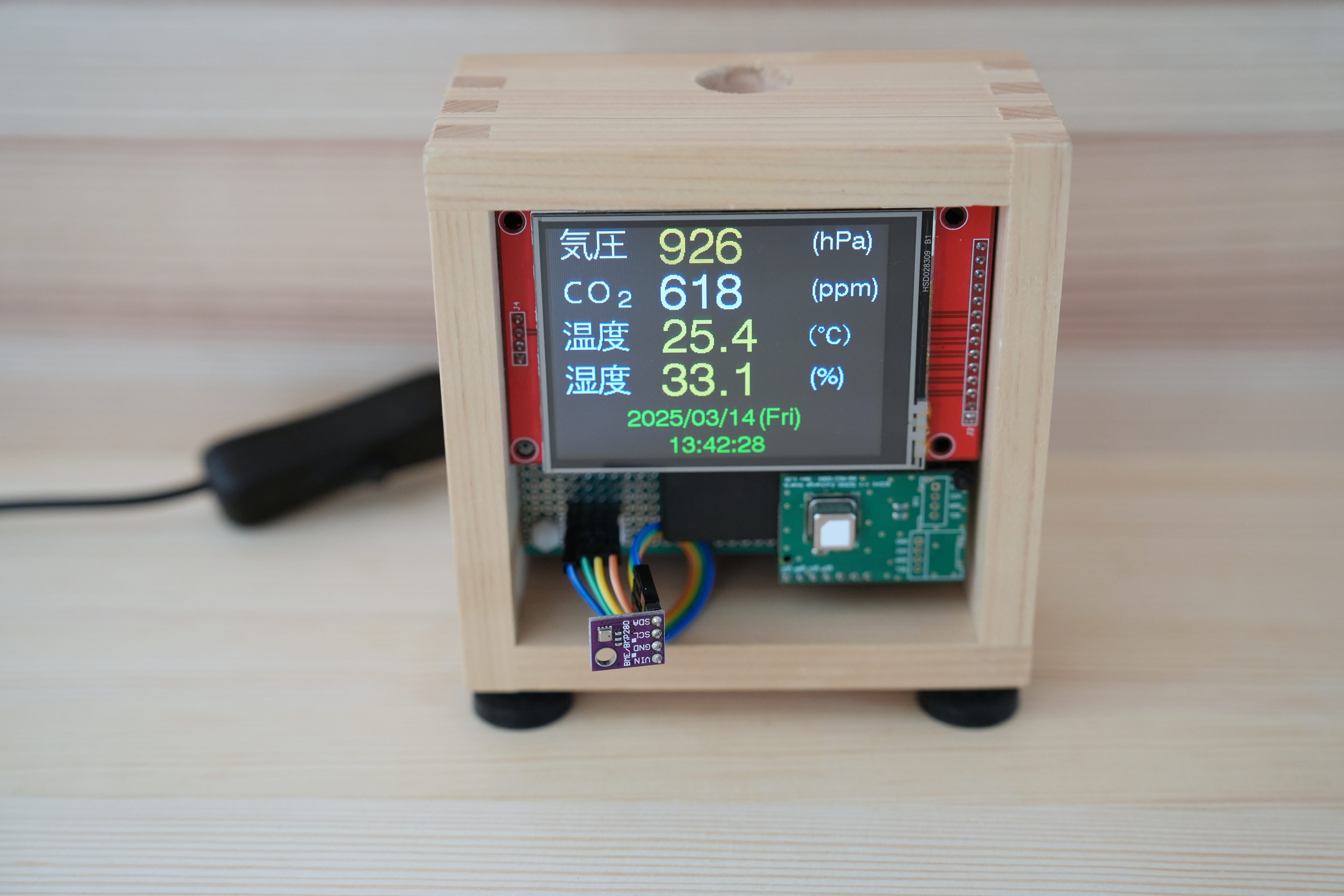 今回使ったパーツの中で最も大きな2.8インチTFT液晶(ILI9341)モジュールの横幅が二合枡の内部寸法にジャストフィットで収まりました。センサ類は外気に晒しておきたいので前面下部に設置。