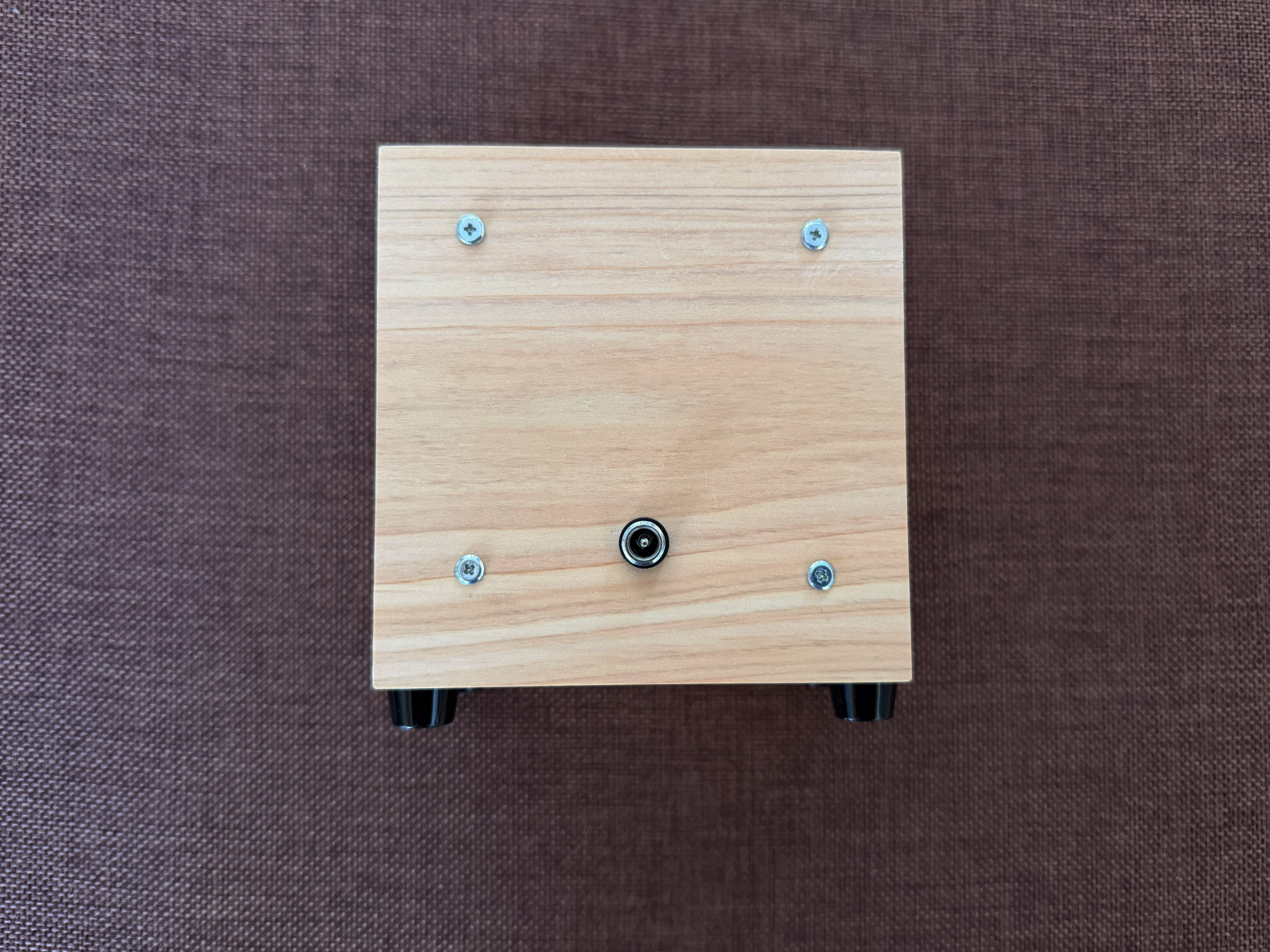 二合枡の背面に8mm φ の木工用ドリルで穴あけしてACアダプタとつなぐ2.1mm標準DCジャックを装着。開けた穴径がやや大きかったので2.1mm標準DCジャックのねじ部分に強力両面テープを1周巻いてからねじ込んで接着。