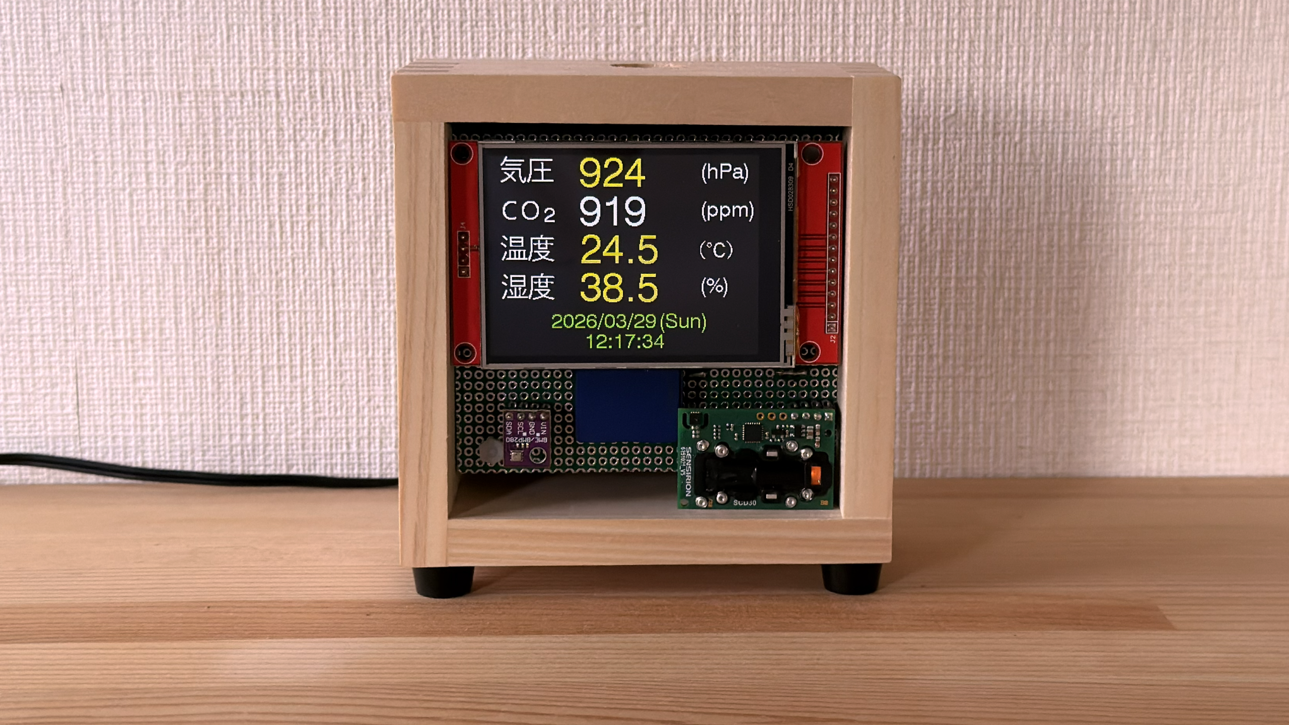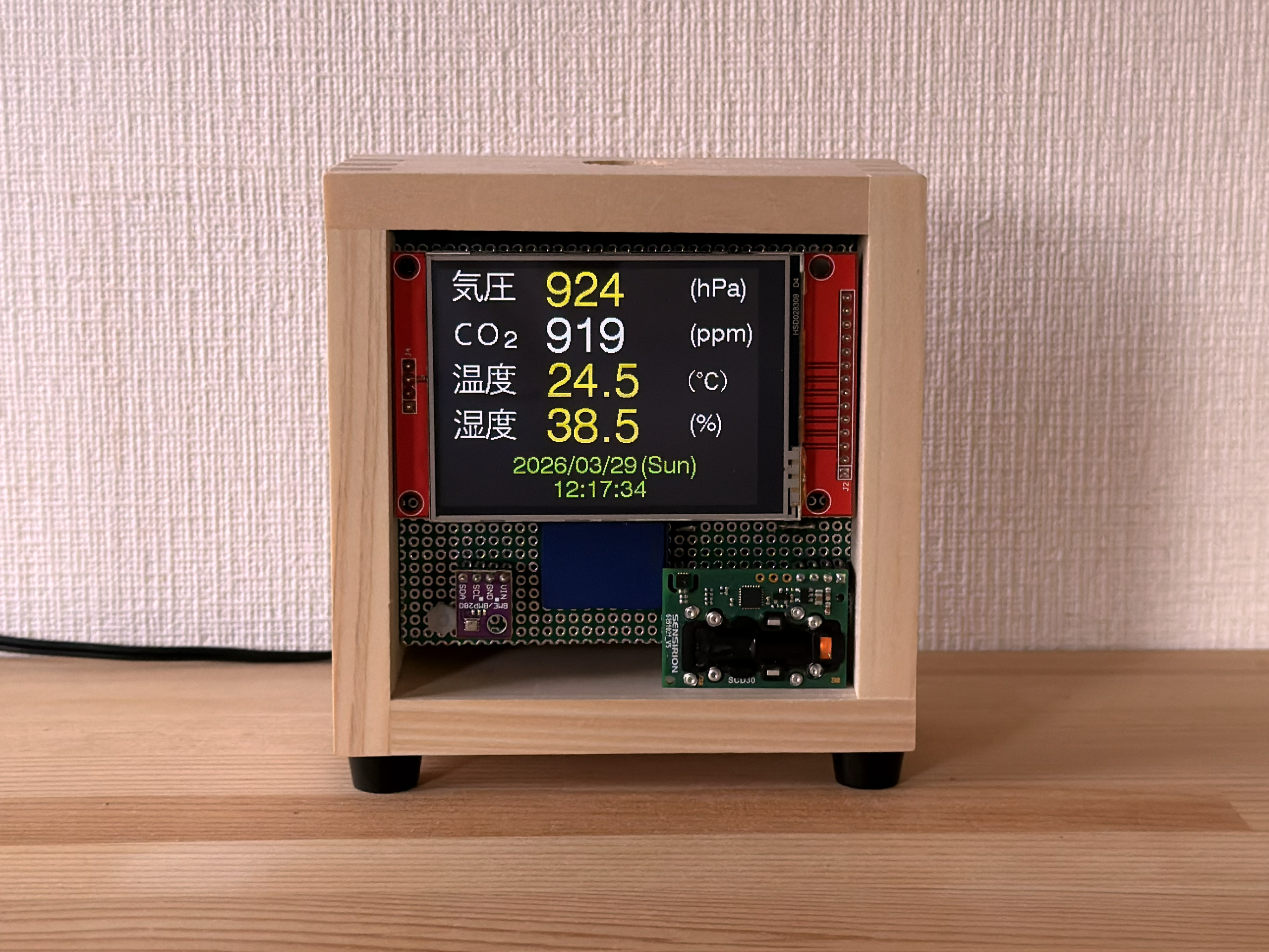 今回使ったパーツの中で最も大きな2.8インチTFT液晶(ILI9341)モジュールの横幅が二合枡の内部寸法にジャストフィット。CO2濃度センサSCD30、気圧・温湿度センサBME280は外気に晒しておきたいのでケースおもて面下部に設置しました。