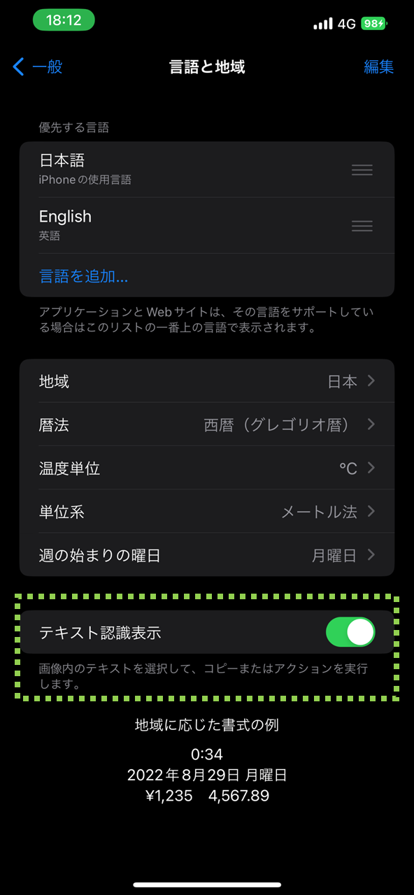 テキスト認識表示(Live Text)を有効にするには、iOS 16へアップデートしたiPhoneで「設定」—>「一般」—>「地域と言語」をタップして、「テキスト認識表示」を有効化します。