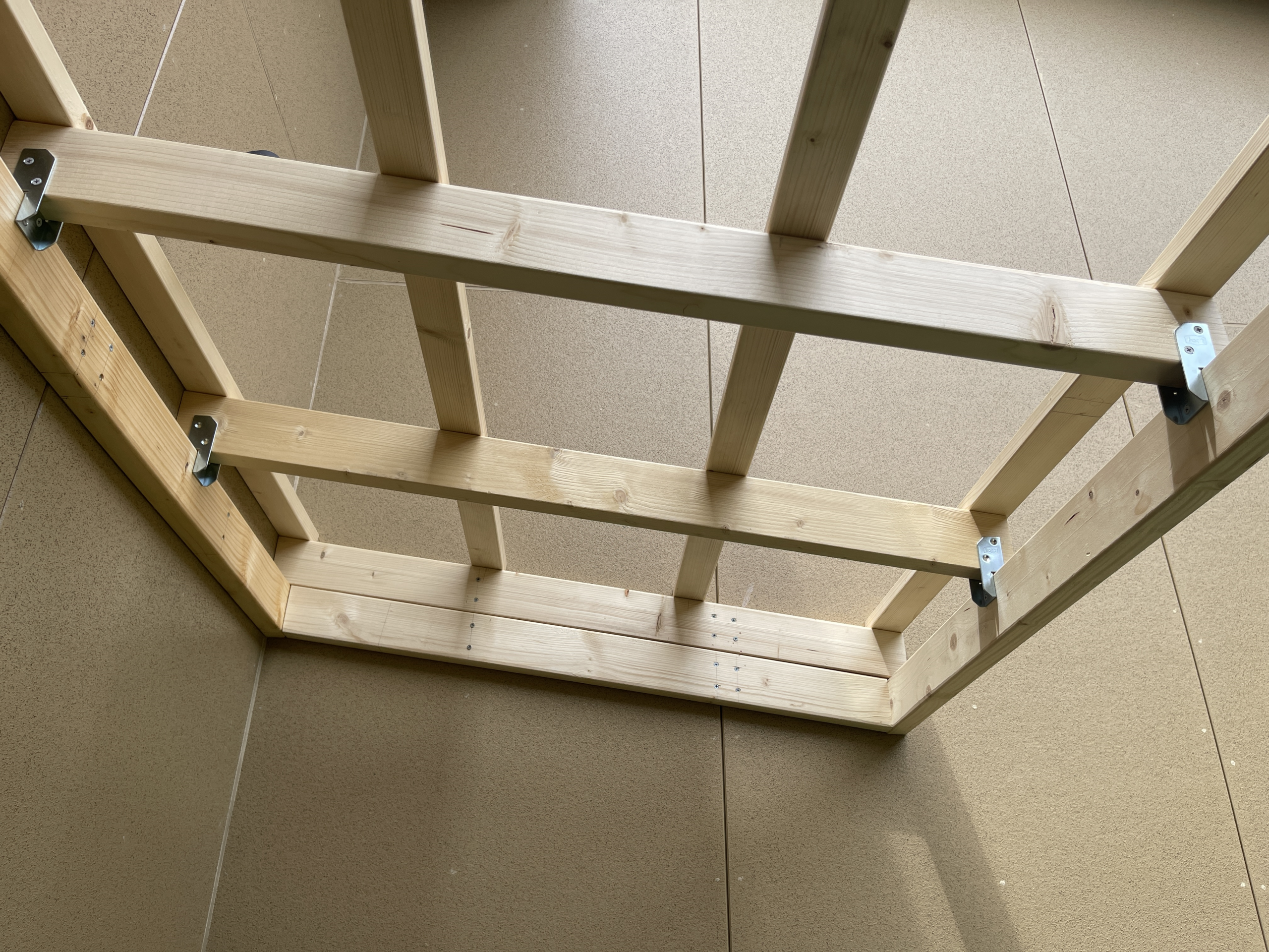 壁面の垂木にに2×4材を4.2 x 65mmねじで固定、2×4材を交差させる部分には2×4用金具(ジョイスト J5 FRT-059)を使って固定。