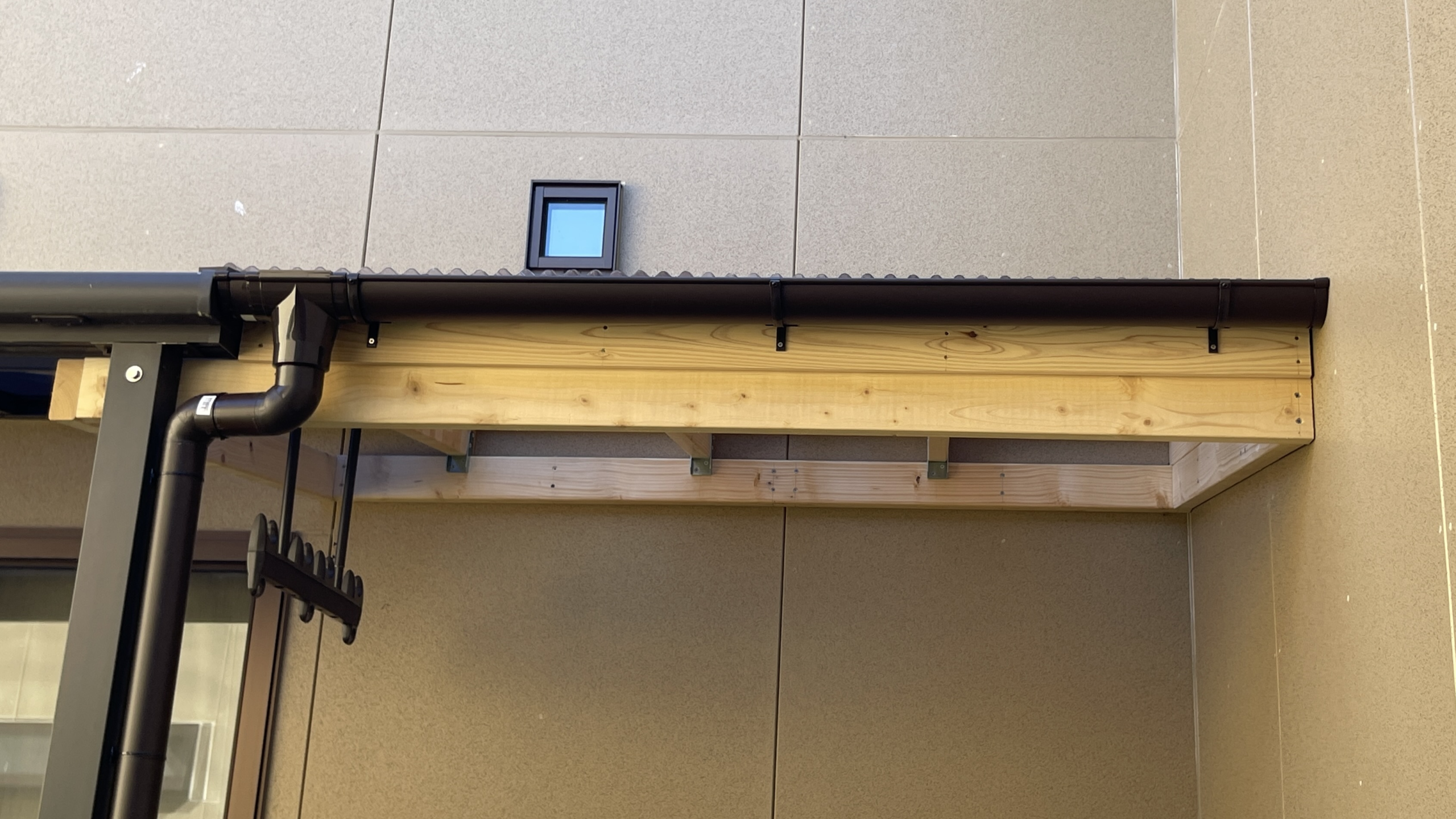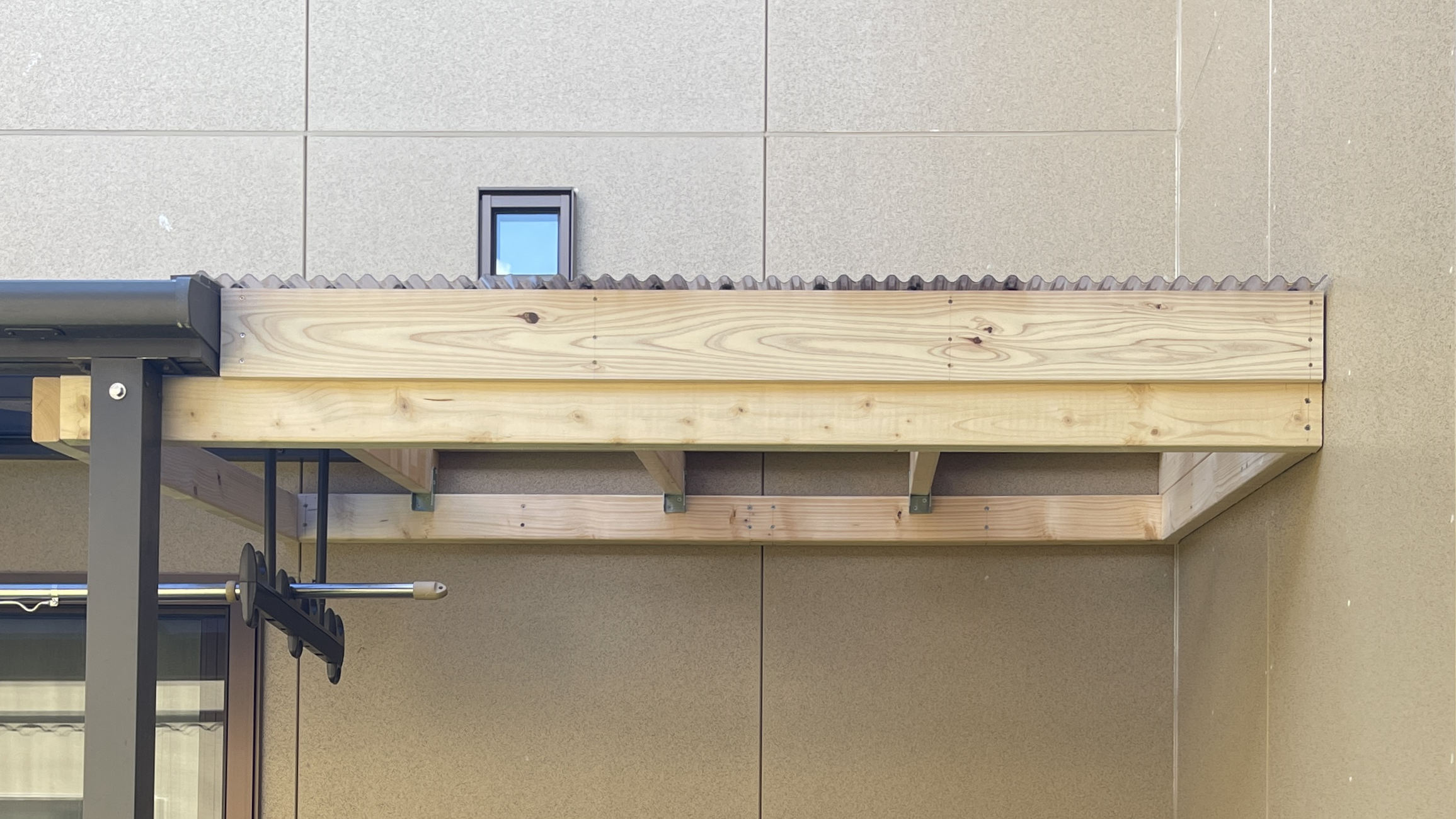 - 既存のメーカー製テラス屋根(アルミ骨格とポリカ平板、支柱2本、専用の雨どい付き)と今回DIYする2×材とポリカ波板屋根の高さ、傾斜角度、雨どいを含めた軒の出の長さをそろえる。