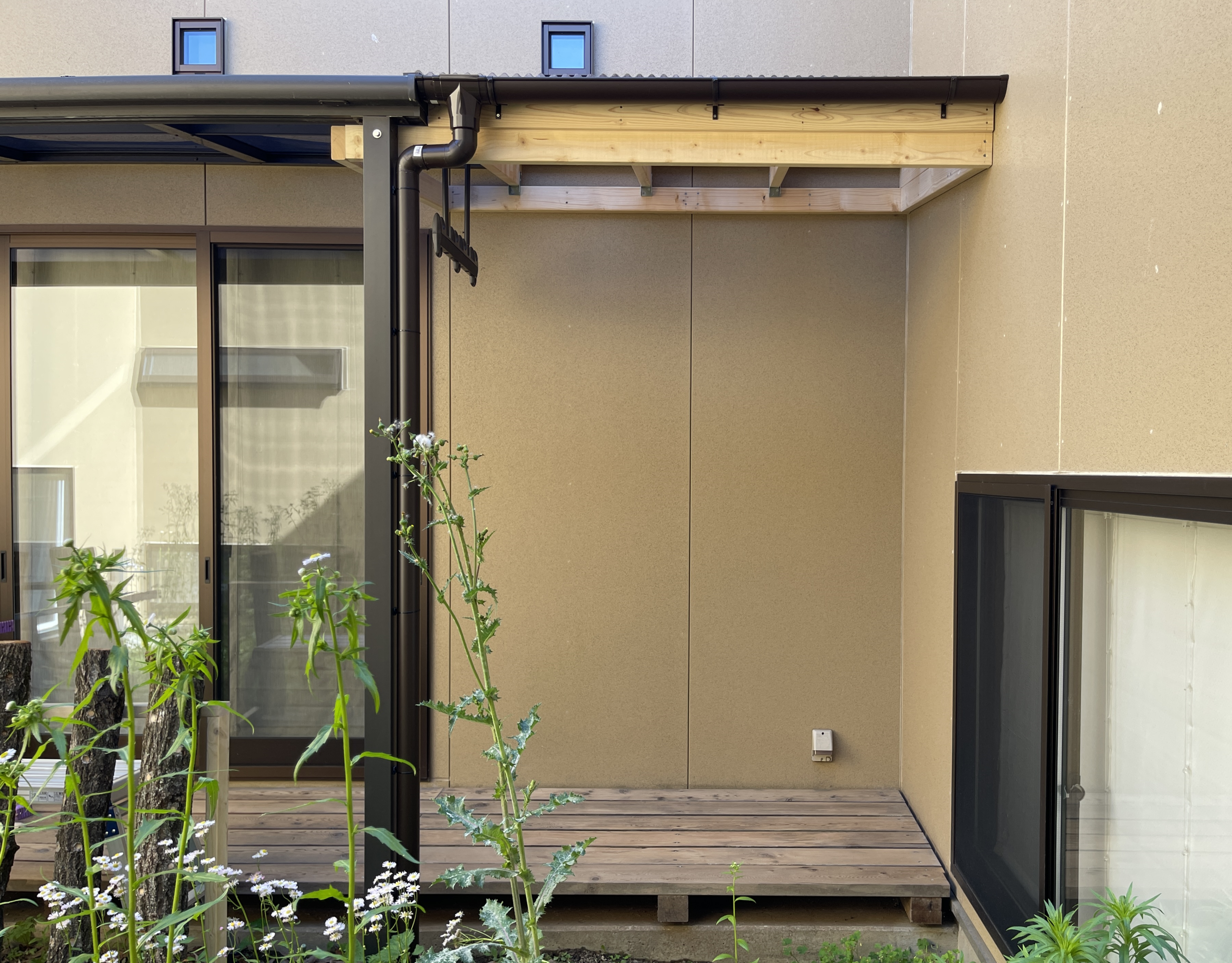中庭にはメーカー製の雨どい付きのテラス屋根があって雨をしのげるのですが、左端1.5m部分には屋根が足りなくてテラス床の木材が雨に晒され腐食が進み傷んできました。ポリカ波板と2×材(ツーバイ材)を使ってテラス屋根をDIYで延長工事した際のメモです。