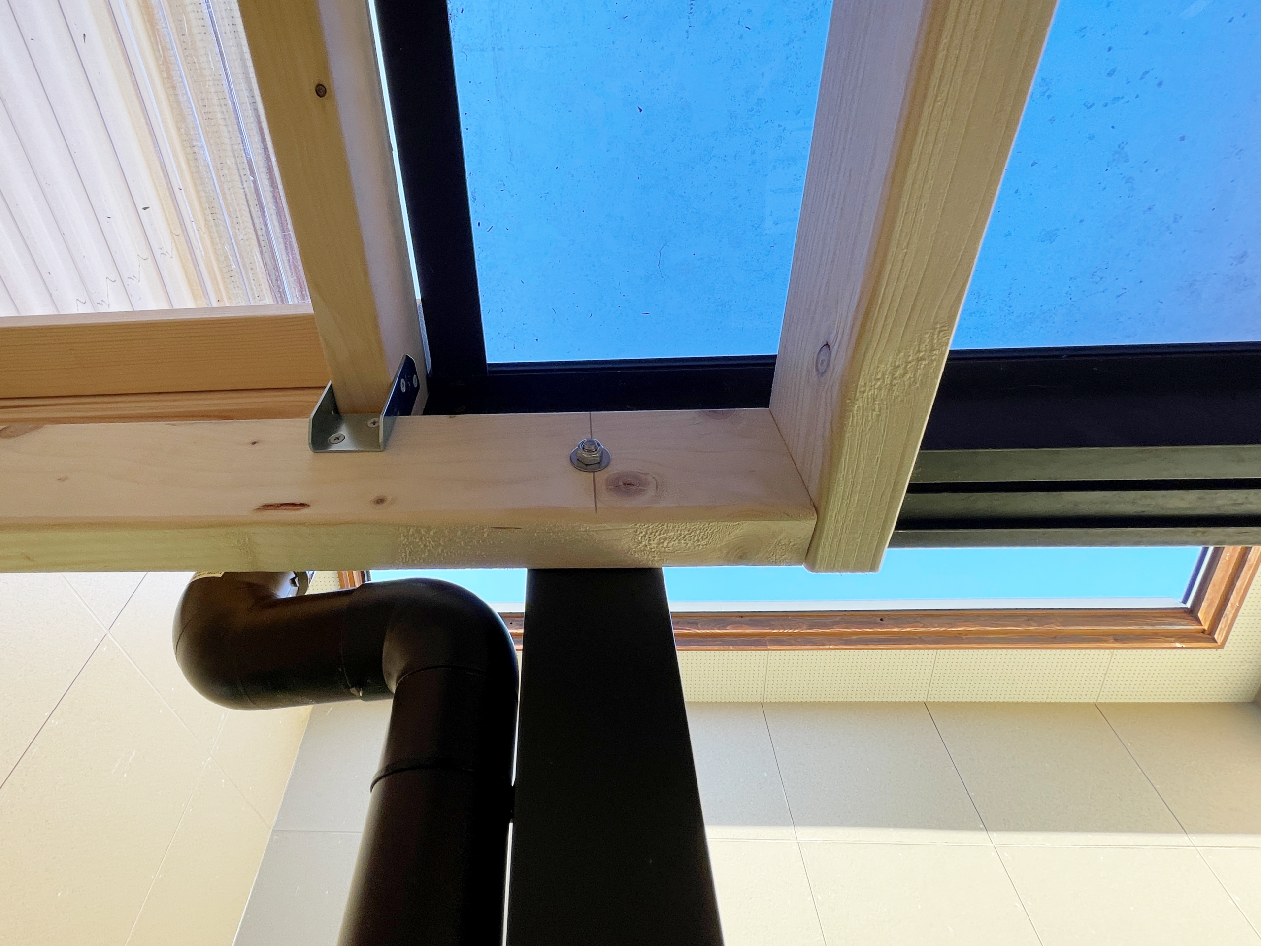 外壁に接する2×4材には既存のテラス屋根と同じ勾配をつけて施工。勾配7度に合わせて2X4材の端を斜めにカットしています。M8 x 120mmねじの六角ボルトとステンレスワッシャー、ゆるみ止めナットを使って 、2×4材を既存のテラス屋根のアルミ角支柱に固定。