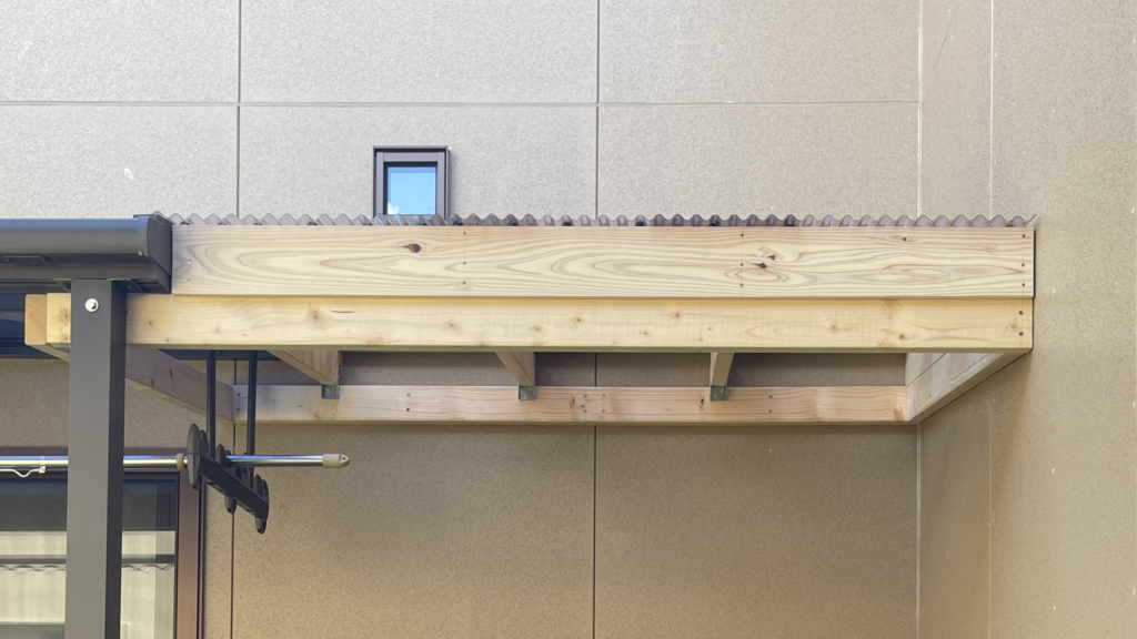 - 既存のメーカー製テラス屋根(アルミ骨格とポリカ平板、支柱2本、専用の雨どい付き)と今回DIYする2×4とポリカ波板屋根の高さ、傾斜角度、雨どいを含めた軒の出の長さをそろえる。