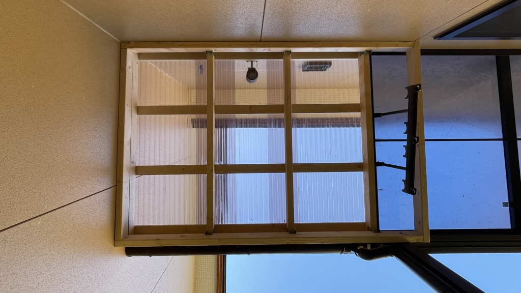 ポリカ波板屋根の寸法は現物の寸法にあわせて都度調整しながらの組み立てです。